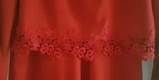 Elegante mono de color rojo, perfecto para ocasiones especiales. Presenta un diseño con detalles de encaje en la parte superior. - Escote con detalle de encaje. - Manga corta. - Cintura marcada. - Pantalón largo.