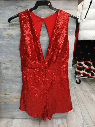 Mono corto con un diseño llamativo de lentejuelas rojas y un escote pronunciado. Cuenta con forro interior para mayor comodidad. Espalda descubierta. Talla 38/40 - Diseño de lentejuelas. - Escote pronunciado. - Forro interior.