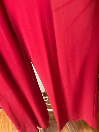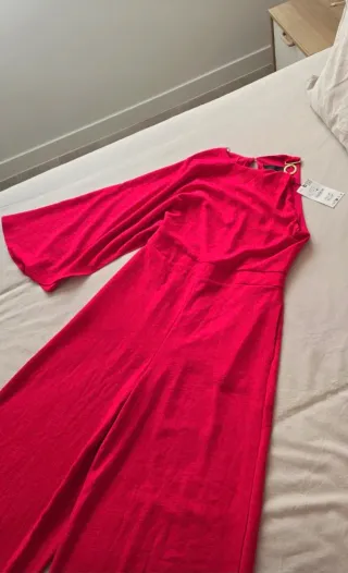 Mono largo de Zara en color rojo. Mono rojo Zara Talla L, por su modelo podria quedar bien también en una talla XL. La parte de arriba queda ajustada en la cintura, muy favorecedor. Pantalón ligeramente holgado y cremallera frontal. El color real es el de las dos últimas fotos (rojo más suave). En muy buen estado. - Diseño elegante y moderno. - Corte favorecedor. - Ideal para ocasiones especiales o para un look sofisticado.