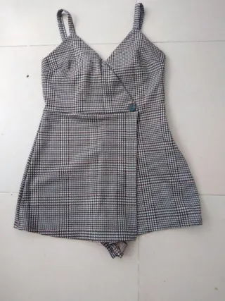 Mono con estampado de cuadros. - Diseño cruzado en la parte delantera. - Detalle de botón. - Tirantes finos.