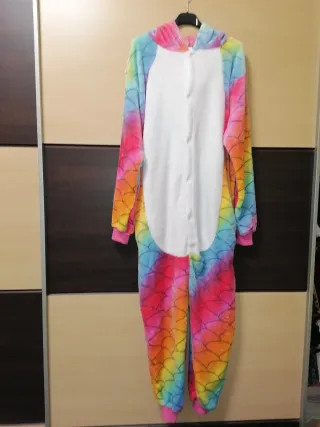 Mono pijama de unicornio con un diseño divertido y colorido. Apenas uso, como nuevo. - Estampado de escamas arcoíris. - Capucha cabeza de unicornio. - Cierre frontal abotonado. - Cola detrás. - Bolsillos laterales.