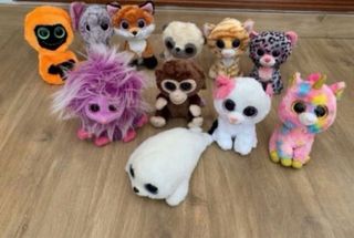 Colección de adorables peluches Beanie Boos. - Peluche naranja con capucha. - Peluche gris con orejas grandes. - Peluche de zorro. - Peluche de mapache. - Peluche de tigre. - Peluche de leopardo. - Peluche morado con pelo largo. - Peluche de mono. - Peluche blanco y negro de gato. - Peluche de unicornio arcoíris. - Peluche de foca blanco. - Se pueden comprar sueltos