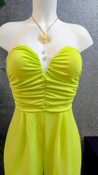 Mono largo sin tirantes y escote corazón. Cocos incorporados.push-up,ayuda a mantener y dar cuerpo al corpiño,cuenta con un precioso drapeado delantero, cierre de cremallera invisible en la espalda.cuenta con pinzas en la parte delantera para que sea más holgado y dar holgura y libertad de movimiento,pernera ancha. Talla única, sirve para S/M. Muy elástico el tejido. Medida de axila a axila 30 cm,de bajo pecho 30 cm ,de largo 117 cm y ancho final de pierna 25 cm Medida Composición: 95€ POLIÉSTER / 5% ELASTANOMono largo de crepé en un vibrante color verde lima. Diseño sin tirantes con escote drapeado y pantalón de pernera ancha.