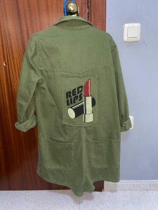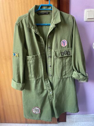 Mono largo de Zara en color verde militar. Presenta un diseño tipo camisa con botones. - Parche 1974 en manga izquierda. - Parche Roller Queens 538 en pecho derecho. - Parche circular con diseño en bajo izquierdo.