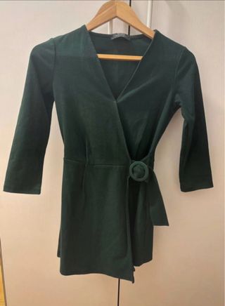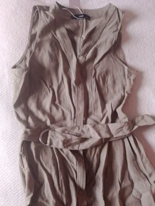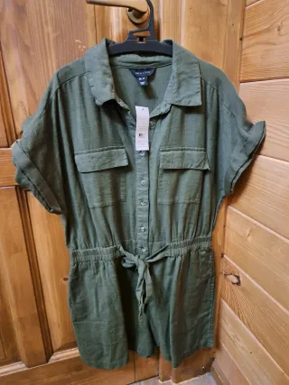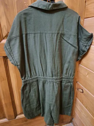 Mono corto de la marca New Look en color verde militar. Es una prenda cómoda y versátil. - Diseño con cuello camisero. - Cierre de botones en la parte delantera. - Cintura elástica con cinturón. - Bolsillos en el pecho.