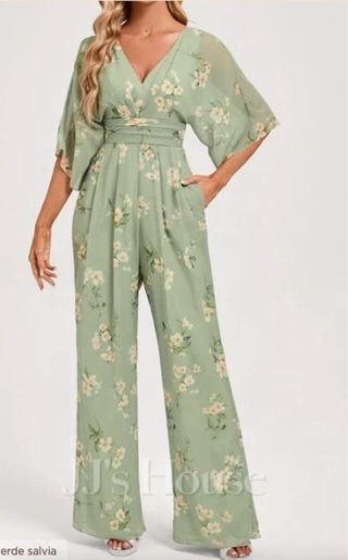 Elegante mono largo de color verde agua con un estampado floral en tonos claros. Presenta un escote en V y mangas tipo mariposa. - Cintura marcada con cinturón. - Pantalón ancho. - Tejido ligero y vaporoso. - ideal para bodas - en su embalaje original - Muy buena calidad, totalmente doblado