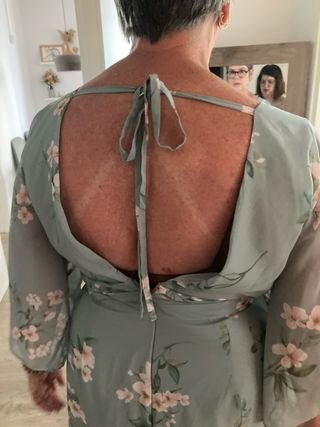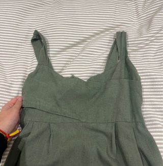 Mono corto verde oliva con escote en V y espalda un poco descubierta. Dos tiras para lazada opcional en la parte de la espalda. Cintura ajustable con lazada.