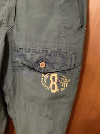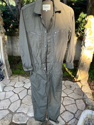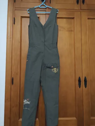 Conjunto de mono y pantalón en talla grande. El color es un verde oliva muy combinable. El mono es de oysho y le faltan 2 botones es un material gruesito - Mono con cuello tipo polo y manga corta. - Pantalón de corte recto.