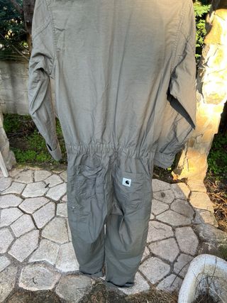 Mono de la marca Carhartt en color verde. Diseño con cuello camisero y cierre de botones. - Dos bolsillos con cremallera en el pecho. - Cintura elástica. - Puños ajustables con botón. Mono peto carhartt verde militar manga larga y largo muy comodo talla s