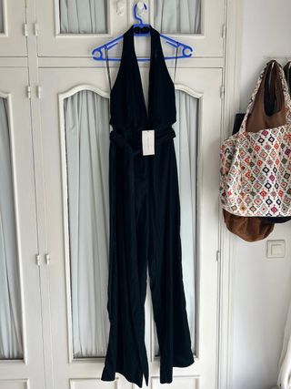 Mono largo de tela suave y fluida, con escote pronunciado y tirantes que se anudan en la nuca, permitiendo múltiples formas de atar. - Diseño multiposición. - Cintura elástica. - Piernas anchas.