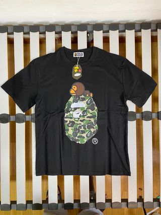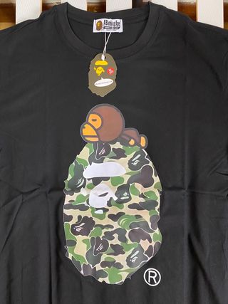 Camiseta de la marca Bape con un diseño llamativo. - Estampado de camuflaje. - Detalle de mono. - Logo de la marca.