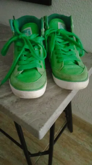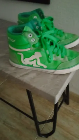 Zapatillas deportivas de caña alta con un diseño llamativo. - Color principal verde vibrante. - Detalle de un mono blanco en el lateral. - Cordones a juego.