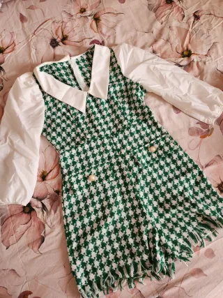Mono corto de tweed con estampado de pata de gallo. - Diseño con cuello blanco. - Mangas abullonadas blancas. - Dos bolsillos delanteros con botones dorados. - Bajo deshilachado.