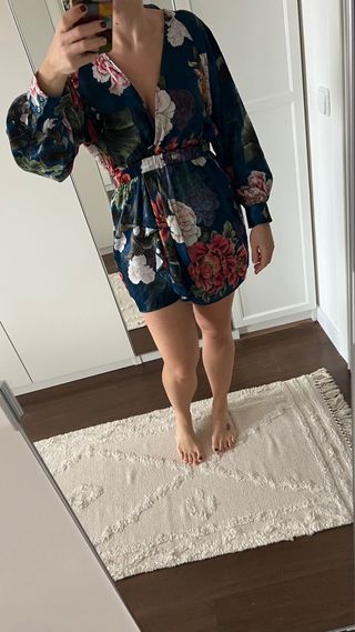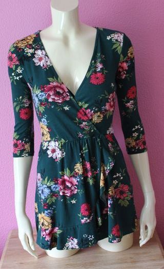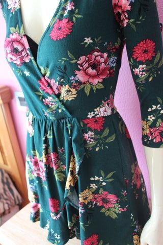 Mono corto con estampado floral de Bershka. Diseño cruzado con manga tres cuartos y detalle de volante en el bajo. Un lado tiene pelusilla al llevar ahi el bolso - Estampado multicolor sobre fondo verde. - Escote en V. - Cintura elástica.
