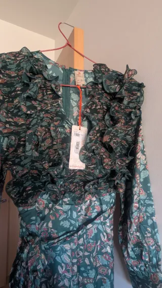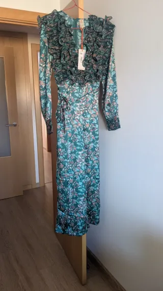 Mono largo tipo raso/satén con estampado floral. Presenta un diseño con volantes/chorreras en el escote y cierre de lazada. Muy elegante. Ideal Navidad/Nochevieja - Manga larga abullonada. - Estampado floral multicolor sobre fondo verde. Sin estrenar