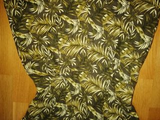 Fondo verde oscuro con estampado de hojas.De Fórmula joven. Entallado en cintura con goma en parte trasera. Escote en V.