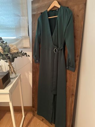 Elegante mono largo de color verde botella con un diseño favorecedor. Usado una vez en una boda. - Manga acampanada. - Cinturón a juego anudado. - Escote en pico cruzado.