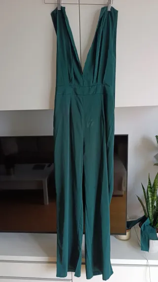 Mono moderno de color verde. - Diseño con escote pronunciado. - Piernas anchas. -con la tela de la parte de arriba, puedes abrochar lo arriba, y queda la espalda descubierta . O cruzarlo por la espalda