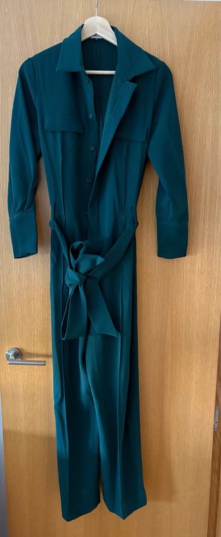 Mono largo de color verde oscuro, con cinturón. - Diseño con cuello camisero. - Cierre de botones. - Bolsillos. - Piernas ajustadas.