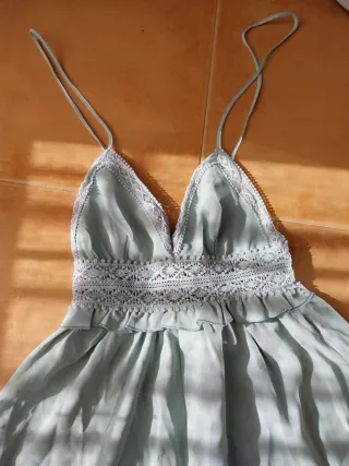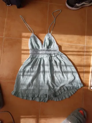 Solo usado 1 vez. Tejido súper suave y cómodo. Color verde menta súper bonito. Pone talla XXS pero yo uso XS y me va perfecto. Medidas: pecho de sisa a sisa 44cm como lleva escote cruzado se adapta a diferentes tallas de pecho y da más Cintura elástica sin estirar 30cm Largo total desde hombro 1’29cm (solo pantalón desde cinturilla 88cm). Ancho de pierna 29cm.