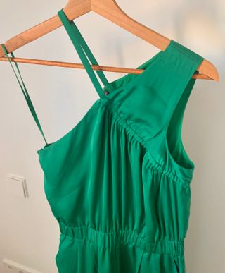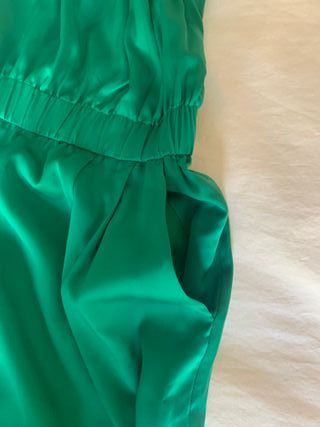 Elegante mono de Zara con un bonito acabado satinado. - Color verde y dorado. - Diseño sin mangas. - Cintura fruncida con detalle de hebilla. - Piernas anchas. usado una vez