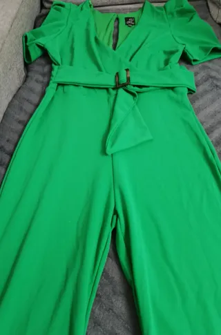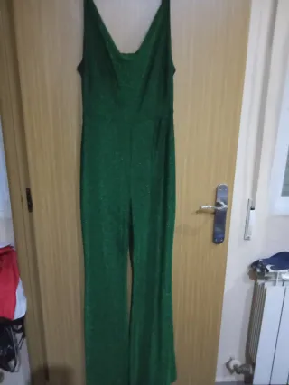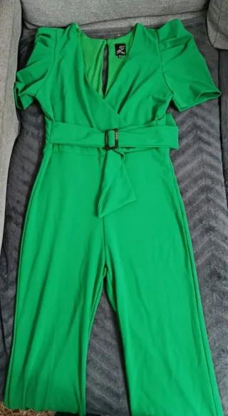 Mono elegante de terciopelo en color verde. Es una prenda nueva con etiqueta. - Diseño con cinturón anudado. - Corte amplio en las piernas. - bolsillos lateral. Muy bonito pero me queda muy justo. - Manga corta. tengo otro en color negro misma talla y con etiqueta, sin estrenar.