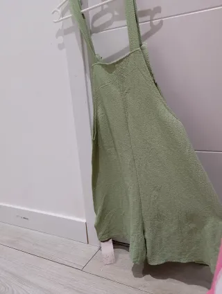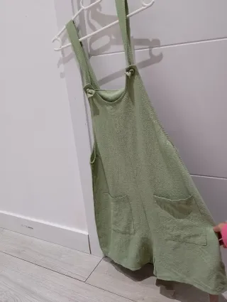 Mono midi verde caqui, de tirantes de largo regulable con botón. Tiene bolsillos laterales. Realmente es de la sección de niños, pero la talla equivale a una XS de mujer :) 🔎 Estado del artículo: ¡Muy bueno, aún con mucha vida por delante! 📏 Medidas: 40cm ancho cinturilla elástica, 52cm cadera, 127cm largo. 🧵 Composición: 67% viscosa, 33% lino.