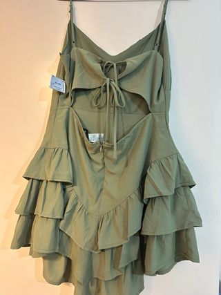 Mono de una pieza en color verde caqui talla xs. Presenta un diseño ajustado con tirantes finos cruzados en la espalda y un escote pronunciado. La parte inferior es larga