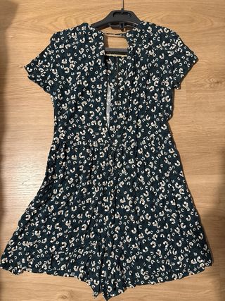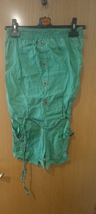Mono cortito verde militar, el escote se puede llevar estilo palabra de honor o escote cuadrado. Por la parte de delante trae botones de decoración, con cinturón ajustable y bolsillos larerales. Las mangas son 3/4. Tejido muy agradable, bastante firme, se necesita planchar dado que tiende a arrugarse.no da mucha talla.T.S.