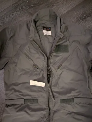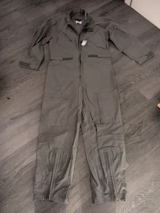 Mono de vuelo de una pieza en color verde militar. Diseñado para la comodidad y funcionalidad. - Cierre frontal con cremallera. - Múltiples bolsillos con cremallera y solapa. - Puños y tobillos ajustables.