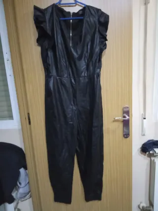 Mono elegante de efecto piel, perfecto para un look moderno. - Diseño con volantes en los hombros. - Cintura con cinturón anudado. - Piernas ajustadas en los tobillos.