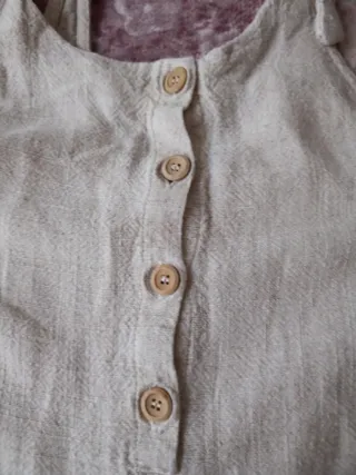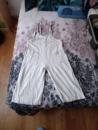 Mono estilo peto en color beige. Ideal para un look casual y cómodo. - Diseño con tirantes. - Cierre de botones en la parte delantera. - Bolsillos en la parte delantera y trasera.