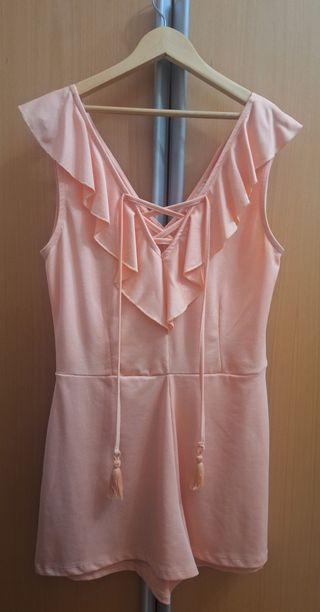Mono corto de color rosa palo con un diseño cruzado en la parte delantera y detalle de nudo en la cintura. - Manga francesa. - Corte holgado en la parte inferior. - Talla s pero vale para m