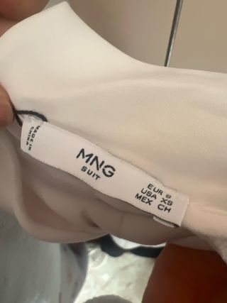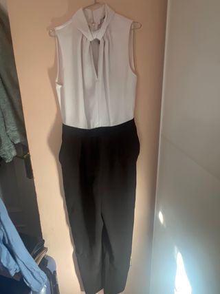 Elegante mono de Mango con diseño de dos piezas. - Parte superior blanca con cuello alto y detalle de lazada. - Pantalón negro de corte recto.