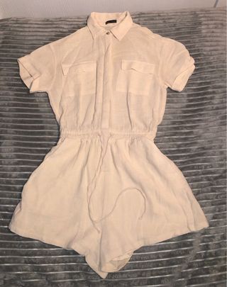 Mono corto de estilo vaquero en color blanco roto. Presenta un diseño con cuello camisero y cierre de cremallera frontal. - Dos bolsillos de parche en la parte superior del pecho. - Cintura marcada con trabillas para cinturón. - Bolsillos laterales tipo francés en la parte inferior.