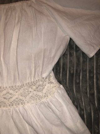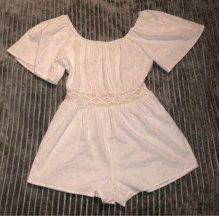 Mono corto de verano con un diseño fresco y ligero. - Escote Bardot. - Manga corta abullonada. - Cintura elástica con detalle de encaje. - Tejido de lino.