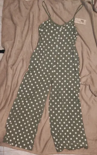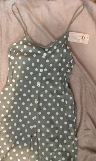 Mono largo con estampado de lunares blancos sobre fondo verde. Tiene tirantes finos y botones en la parte delantera. Viene para ponerle una cuerdecita o cinturón pero yo no tengo ninguna. Nuevo con etiqueta. - Estampado de lunares. - Tirantes finos. - Cierre de botones.