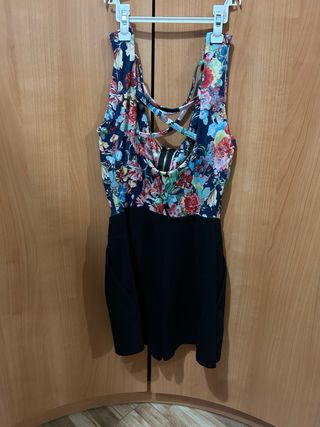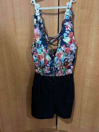 Mono corto con un diseño llamativo y moderno. - Parte superior con estampado floral multicolor. - Parte inferior en color negro. - Cremallera en la espalda. - Tirantes cruzados en la espalda.