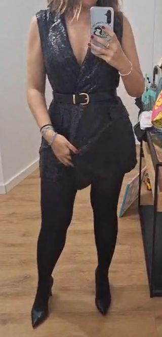 Mono de lentejuelas de Mango, ideal para eventos o salidas nocturnas. Su diseño brillante y elegante te hará destacar. nuevo con etiqueta. tipo blazers - Mono largo. - Escote en V. - Manga sisa. - Cinturón incluido.