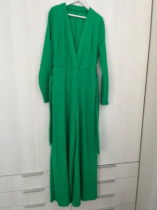 Mono largo de color verde con corte ancho y cinturón. - Diseño con escote en V. - Mangas largas. - Cinturón para ajustar a la cintura. - Bolsillos