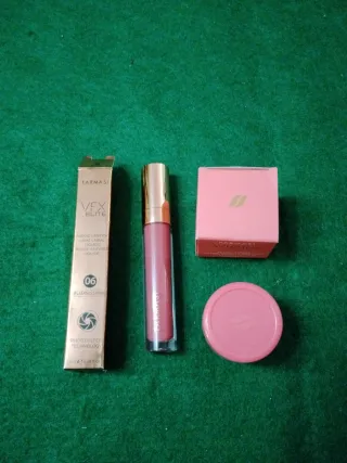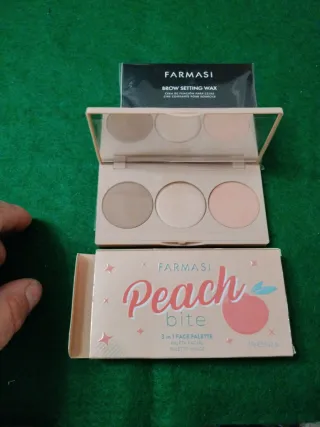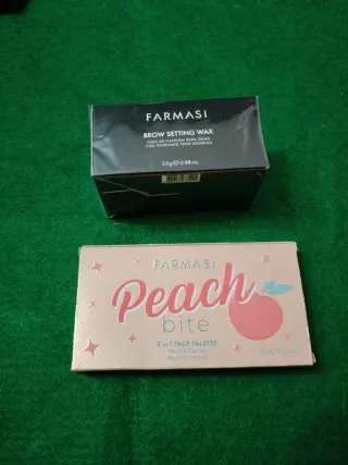 Lote de dos productos de maquillaje Farmasi. - Cera fijadora de cejas Brow Setting Wax (25g / 0.88 oz). - Paleta facial 3 en 1 Peach Bite (15g / 0.52 oz).