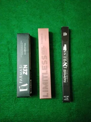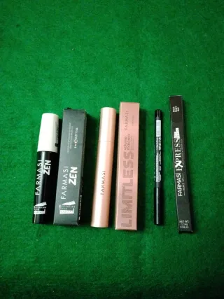 Lote de productos de maquillaje Farmasi. - Dos rímeles Farmasi Zen para extensión de pestañas. - Un lápiz de ojos negro Farmasi Express. - Contenido neto de los rímeles: 8 ml (0.27 fl.oz.) cada uno. - Contenido neto del lápiz de ojos: 1.14g (0.04 oz.).