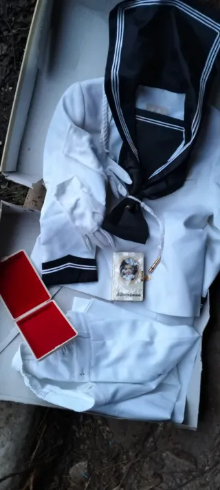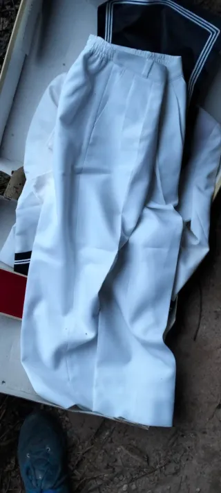 Conjunto de traje de comunión estilo marinero. - Pantalón blanco con cintura elástica. - Parte superior con cuello marinero negro y detalles de rayas blancas.