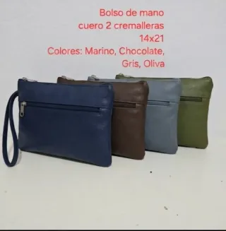 Bolso de mano fabricado en cuero con dos cremalleras y unas medidas de 14x21. Y barios modelos de monederos y colores PRECIOS POR WUASSAP EN PAQUETES DE 20 UNIDADES SURTIDOS COMPRA MINIMA 5 PAQUETES - Disponible en colores Marino, Chocolate, Gris y Oliva. Precios por wuassap