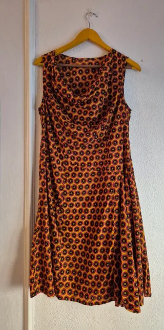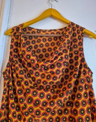 Vestido de algodón 100% con un vibrante estampado. - Diseño sin mangas. - Cuello drapeado. - Largo midi