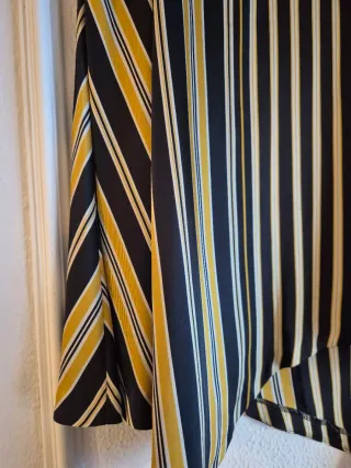 Falda de Stradivarius con un diseño de rayas verticales en negro y amarillo. El corte es asimétrico y fluido, con una caída muy favorecedora. - Diseño de rayas verticales. - Corte asimétrico. - Tejido ligero y con movimiento. - Forro interior No envío planchada