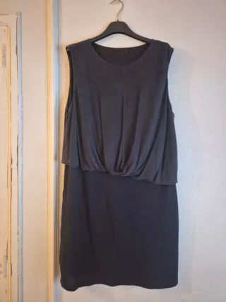 Vestido negro de manga tres cuartos y corte recto. - Cuello redondo con detalle. - Cremallera en la espalda. - Bajo asimétrico.