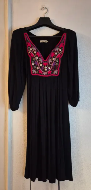 Vestido midi de manga larga con un llamativo escote en V adornado con bordados y lentejuelas. - Escote con diseño de mariposa en tonos rojo cereza, morado y gris. - Detalle de lentejuelas plateadas. - Mangas largas abullonadas. - Cintura marcada con pinzas y falda con caída. - Incluye cinturón fino a juego.