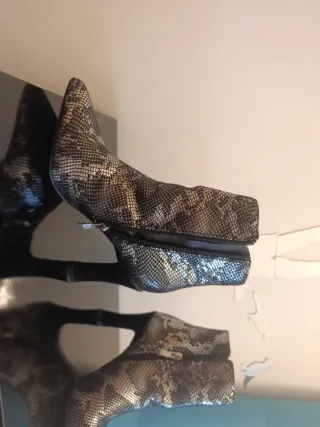 Botines con un llamativo estampado de piel de serpiente en tonos plateados y negros. El diseño es elegante y moderno. - Tacón alto y fino. - Cierre de cremallera lateral. - Punta afilada.