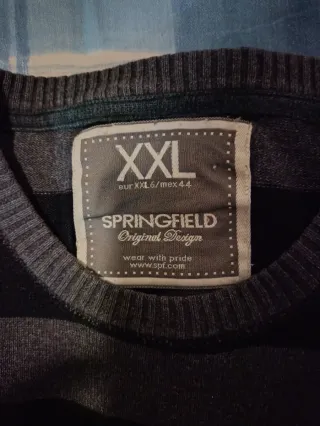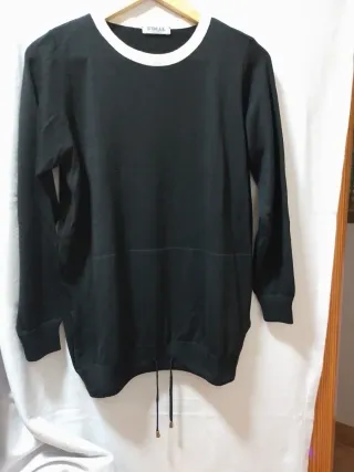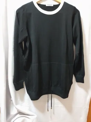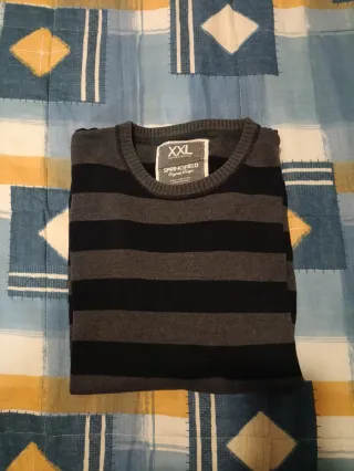 Jersey de punto, estampado rayas negras y grises. Cuello caja , cuello redondo. Talla XXL pero se corresponde con una XL.